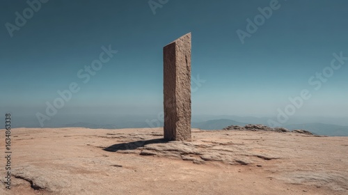 Solitary weathered stone monument stands tall on a barren rocky summit under a clear blue sky