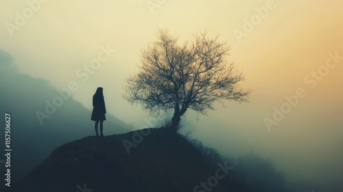 Solitude: A woman stands on a misty hilltop, a lone tree by her side, shrouded in the quiet mystery of a fading day.