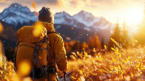 Solitude Trek A Man with Backpack Exploring Mountain Scenery Landscape Golden Hour Adventure Outdoors