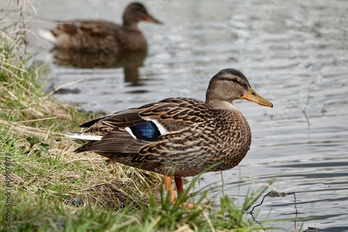 Solo female duck beside on green grass on the shore of the pond. Brown mallard duck standing in natural habitat. High quality photo