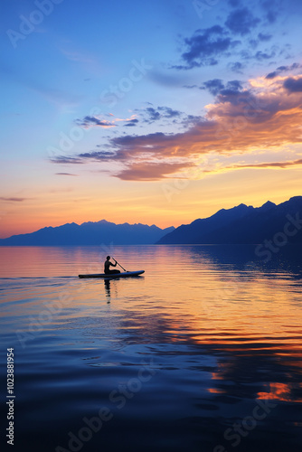 Solo kayaker paddles through golden reflections at sunset on still water.