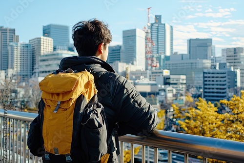 Solo traveler on a bustling bridge overlooking a modern skyline, embodying the spirit of urban exploration,