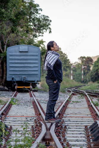 Solo traveller : Asian woman tourist is solo traveling and stand alone at railroad in train station. travel concept