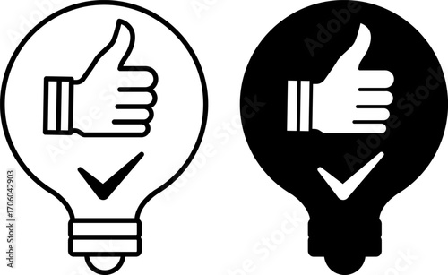 Solution Icons. Black and White Vector Illustration. Light Bulb and Thumbs Up, Like. Answer to Question, Solve Problem. Digital Marketing Concept