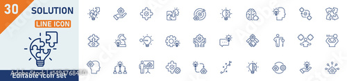 Solution line icon set. Set of 30 outline icons related to problem-solving, idea, puzzles, workflow, innovation, inspiration, and others. Editable stroke. Vector illustration.