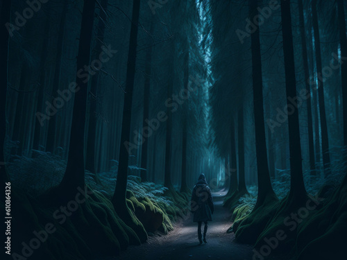 Someone alone strolling in scary dark forest at Midnight. Halloween background, AI generated