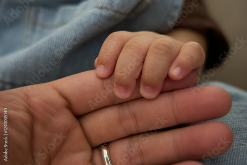 someone holding a baby ' s hand with a ring on it