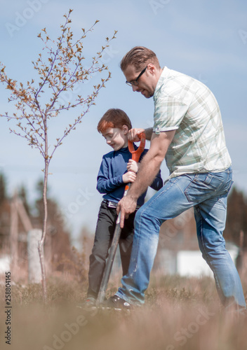 son and father plant a tree together