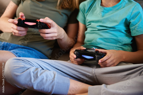 Son and mother playing video game at home, Family spending time together, Happy relationship, Online entertainment and leisure activity