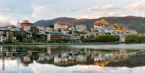 Songzanlin monastery with beautiful water reflection on lake in Shangri-La Yunnan China