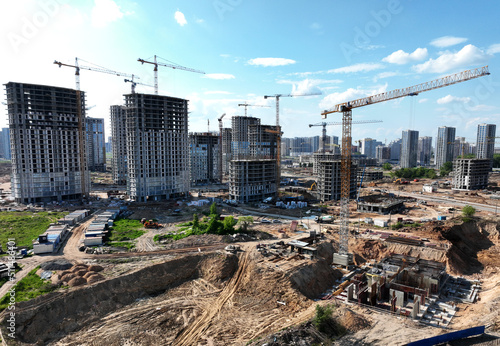 Сonstruction site with tower cranes on building construction. Builder on formworks. Cranes on pouring concrete in formwork. Tower cranes on construction in built environment. Buildings renovation..