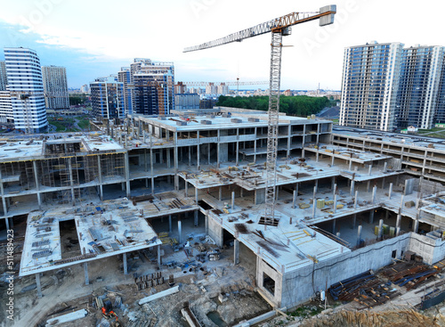 Сonstruction site with tower cranes on building construction. Builder on formworks. Cranes on pouring concrete in formwork. Tower cranes on construction in built environment. Buildings renovation..