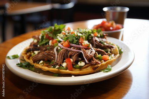 Sopes topped with grilled steak, onions, cilantro, and a slice of jalapeño