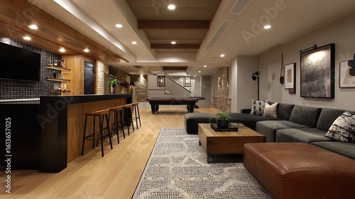 Sophisticated basement design featuring a stylish wet bar, pool table, and cozy seating