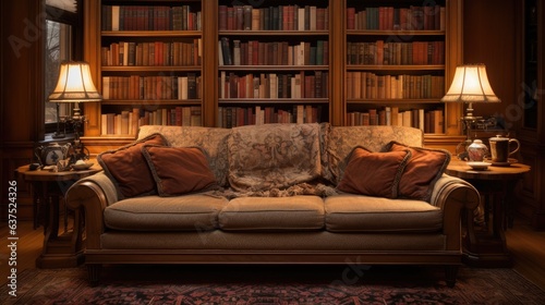 Sophisticated couch in softly lit reading room.