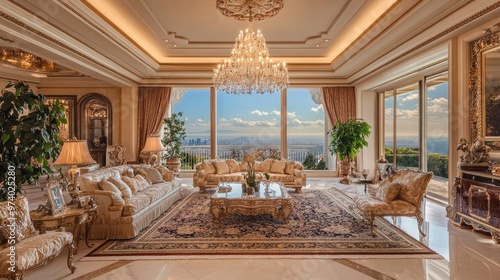 Sophisticated living room with marble floors, plush furniture, a grand chandelier, and a large window that offers a scenic view.