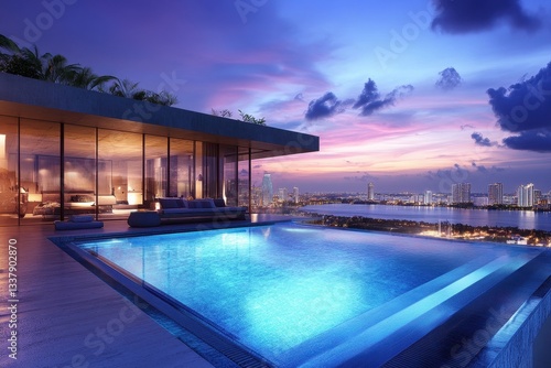 Sophisticated modern villa with a rooftop infinity pool and mesmerizing views of the Miami skyline