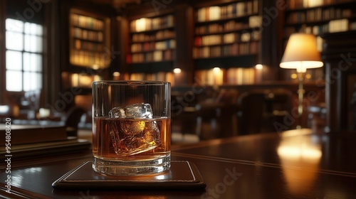 Sophisticated Scotch Whisky with Ice Cube on Mahogany Desk. AI generated illustration