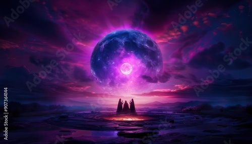 Sorceress circle with witches performing a ritual under the full moon, creating a mystical atmosphere, Mystical, Dark tones, Digital painting