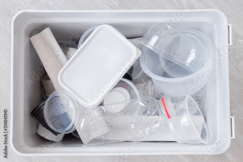 Sorting of garbage in grey recycling bin, filling garbage basket at home - top view, close up. Ecology, separate collection and environmental protection concept