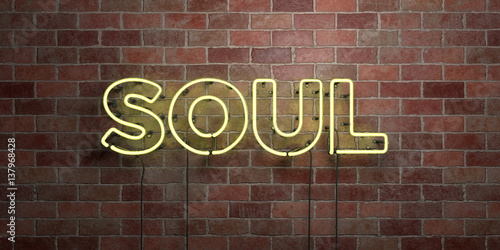 SOUL - fluorescent Neon tube Sign on brickwork - Front view - 3D rendered royalty free stock picture. Can be used for online banner ads and direct mailers..