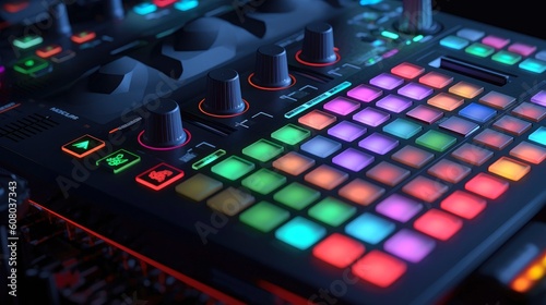 Sound panel for working in the studio and on TV projects. Close-up of the Mixing console. mixing knobs. mix musical tracks on techno party in night club. blurred concept, Generative AI illustration