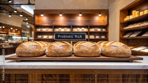 sourdough and probiotic concept. Freshly baked bread loaves displayed in a bakery setting.