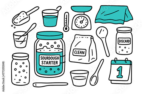 Sourdough Starter Essentials. // Sourdough starter. Hand-drawn doodle illustration Sourdough starter [glass jar (accented), rubber band, starter bubbles