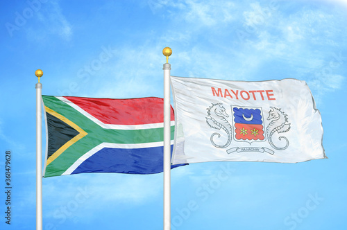 South Africa and Mayotte two flags on flagpoles and blue sky