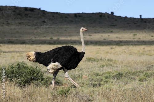 South African ostrich (Struthio camelus australis), adult, male, running, foraging, Mountain Zebra National Park, Eastern Cape, South Africa