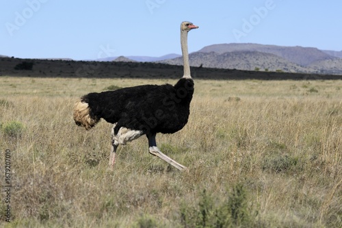 South African ostrich (Struthio camelus australis), adult, male, running, foraging, Mountain Zebra National Park, Eastern Cape, South Africa