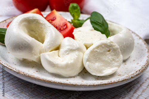 South Italian soft white mozzarella cheese made from buffalo cows milk served with ripe tomatoes and fresh green basil herb