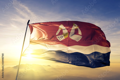 South Karelia region of Finland flag waving on the top sunrise mist fog