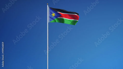 South Sudan flag waving against clean blue sky, long shot, isolated with clipping path mask alpha channel transparency