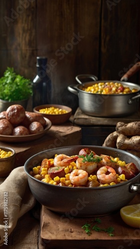 Southern Boiled Shrimp, Sausage, Potatoes, and Corn on Rustic Wooden Table