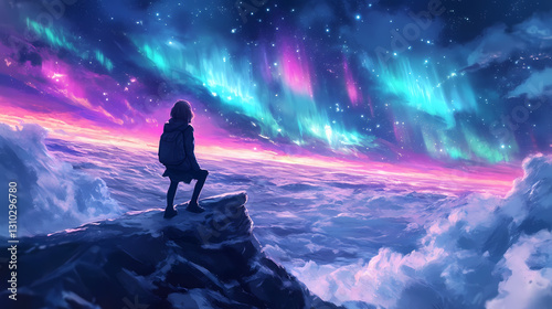 Southern lights, vibrant colors in the night sky, vast icy expanse. Glacial - Iceberg. Illustration