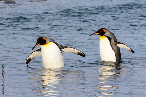 Southern Ocean, South Georgia. Two king penguins wade through the water in the river.