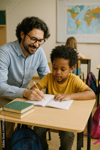 Soutien scolaire individuel entre élève et enseignant dans une salle de classe chaleureuse