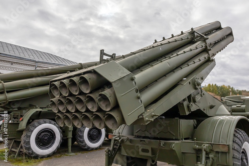 Soviet and Russian multiple rocket launchers. Field jet complex. A combat vehicle mounted on a truck chassis. Weapons with increased firepower. Heavy vehicle with multiple rocket launcher system.