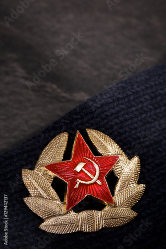 Soviet badge with red star, hammer, sickle and laurel wreath.