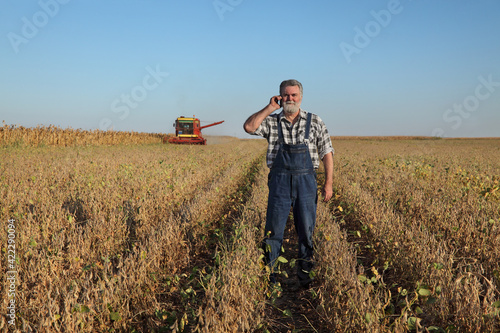 Soy bean harvesting, smiling farmer speaking by mobile phone with combine harvester working in background