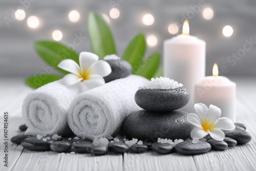 Spa accessories are composed into a set in day spa hotels and beauty wellness centers, with spa products positioned in luxury spa resort rooms for professional massage therapy