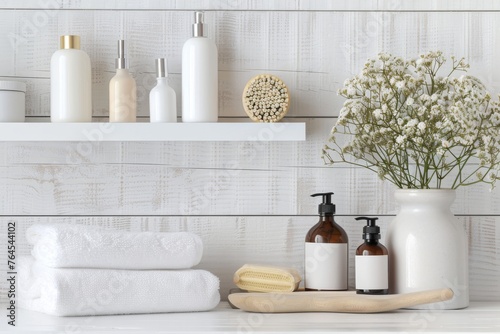 Spa and wellness products on a white shelf. Bathroom interior. No text, no labels