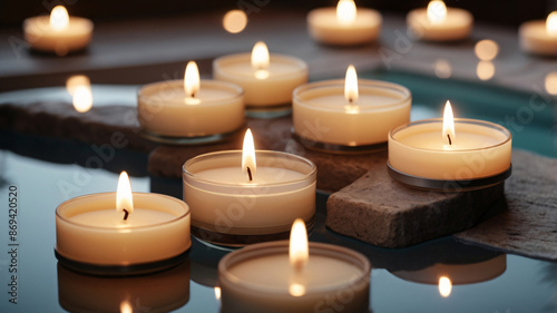Spa, beauty treatment and wellness with massage stones, flowers, towels and burning candles.