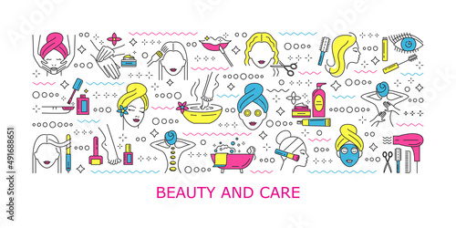 Spa, care and beaty horizontal banner. Collection of icons in modern linear style for spa salon