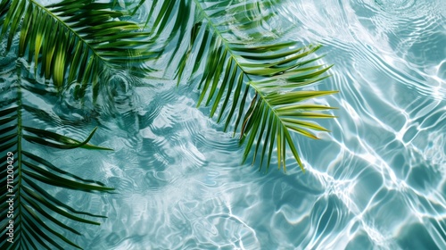 Spa concept with a palm leaf in wavy water. Abstract, transparent tropical water texture surface with palm leaves. top view, beauty backdrop, mockup, spa and wellness, copy space