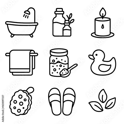 Spa Icon Grid. Outline icon set of spa bath relaxation: bathtub, aromatherapy oils, candle, towel, bath salts,