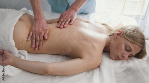 Spa. Massage for blonde woman model - man's hand on girl's back