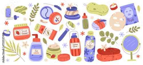 Spa products, beauty face and body skincare cosmetics and accessories floral set vector illustration