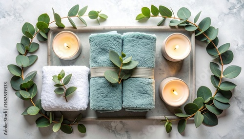 Spa relaxation essentials home setting still life arrangement calm atmosphere top-down view mindfulness concept